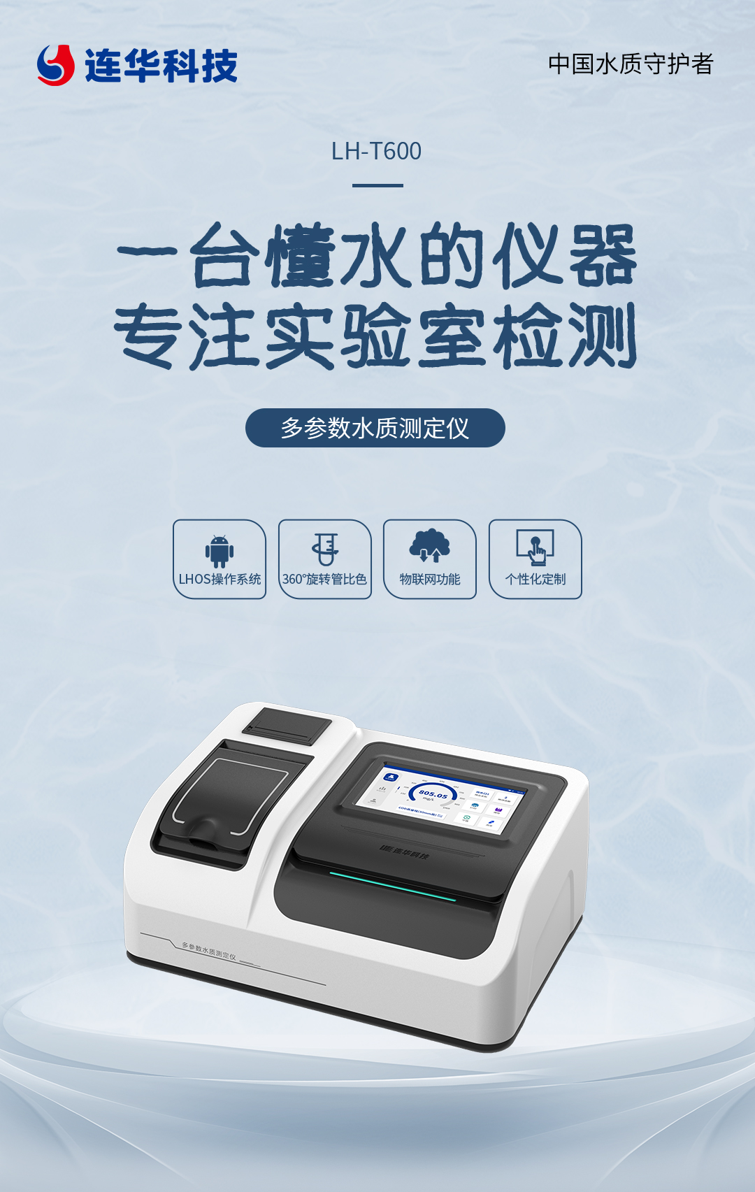 連華科技LH-T600多參數水質測定儀,以其卓越的性能、創新的技術和全面的功能,成為了實驗室水質檢測的佼佼者。選擇連華科技,我們還將為用戶量身定制高效、精準、智能的水質檢測解決方案。憑借42年深耕水質檢測領域的積累,確保解決方案的針對性和實用性,助力用戶輕松應對各種復雜的水質檢測挑戰,讓水質檢測變得簡單,讓水質安全更有保障!