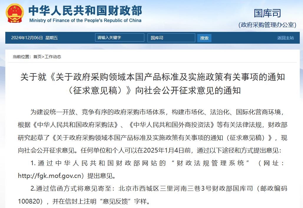 近日,財(cái)政部在其官方網(wǎng)站上發(fā)布了《關(guān)于政府采購領(lǐng)域本國產(chǎn)品標(biāo)準(zhǔn)及實(shí)施政策有關(guān)事項(xiàng)的通知(征求意見稿)》,并向社會(huì)各界公開征求意見。該通知旨在構(gòu)建統(tǒng)一開放、競爭有序的政府采購市場體系,保障各類經(jīng)營主體平等參與政府采購活動(dòng),并明確提出在政府采購活動(dòng)中,給予本國產(chǎn)品相對(duì)于非本國產(chǎn)品20%的價(jià)格評(píng)審優(yōu)惠。