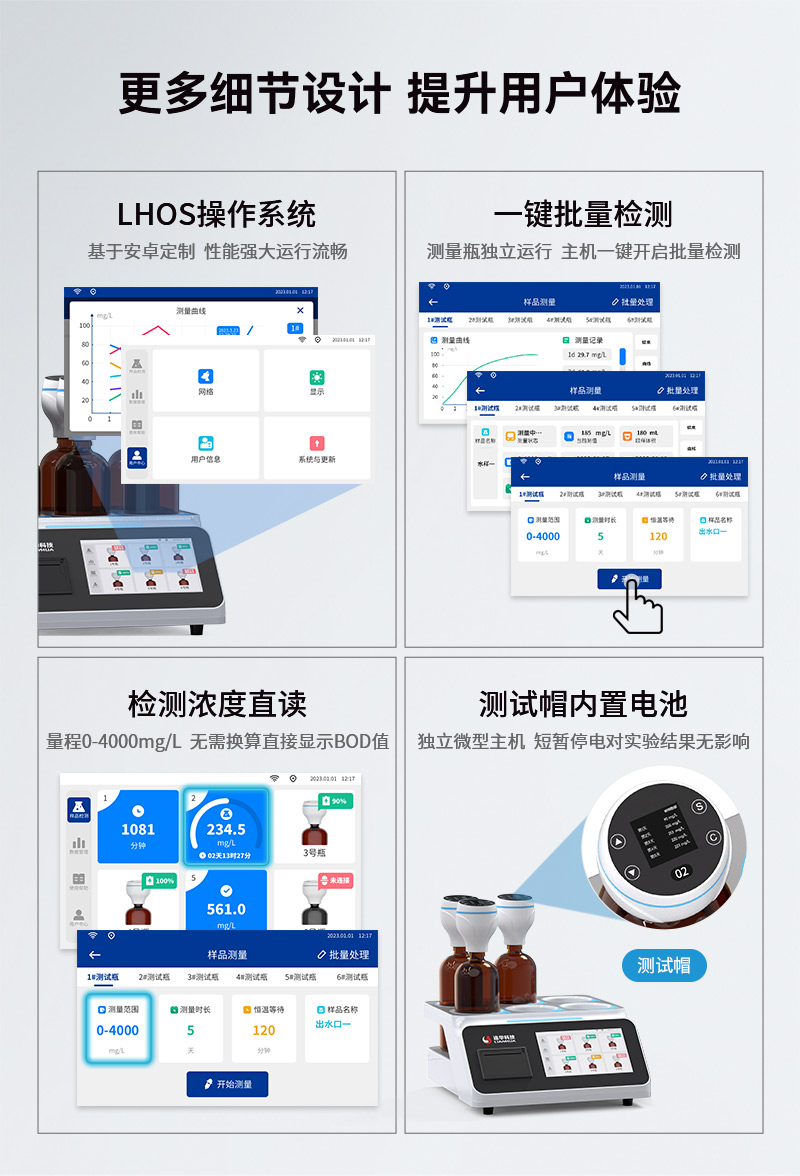 4.量程0-4000mg/L,檢測濃度直讀,無需換算直接顯示BOD值,采用安卓系統(tǒng)算法更新,硬件升級低量程測值更準;