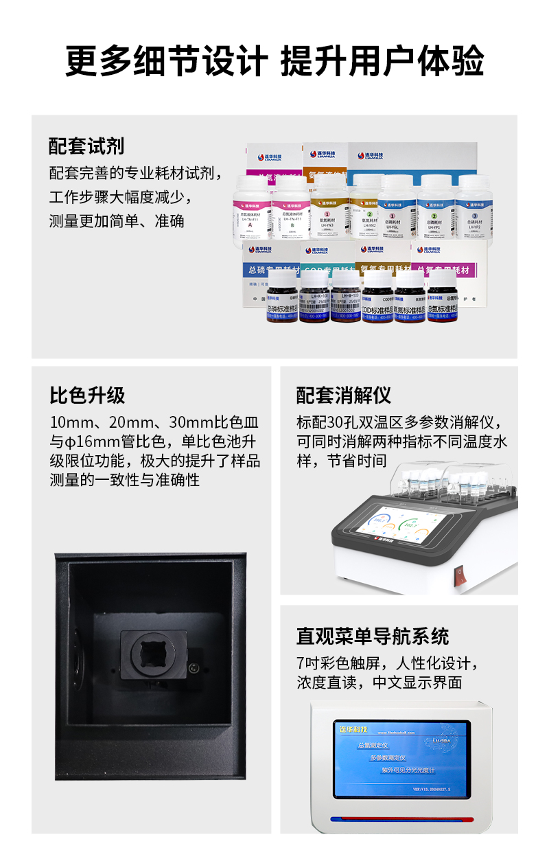 10、配套消解儀:標配30孔雙溫區多參數消解儀(可選配),可同時消解兩種指標不同溫度水樣,節省時間